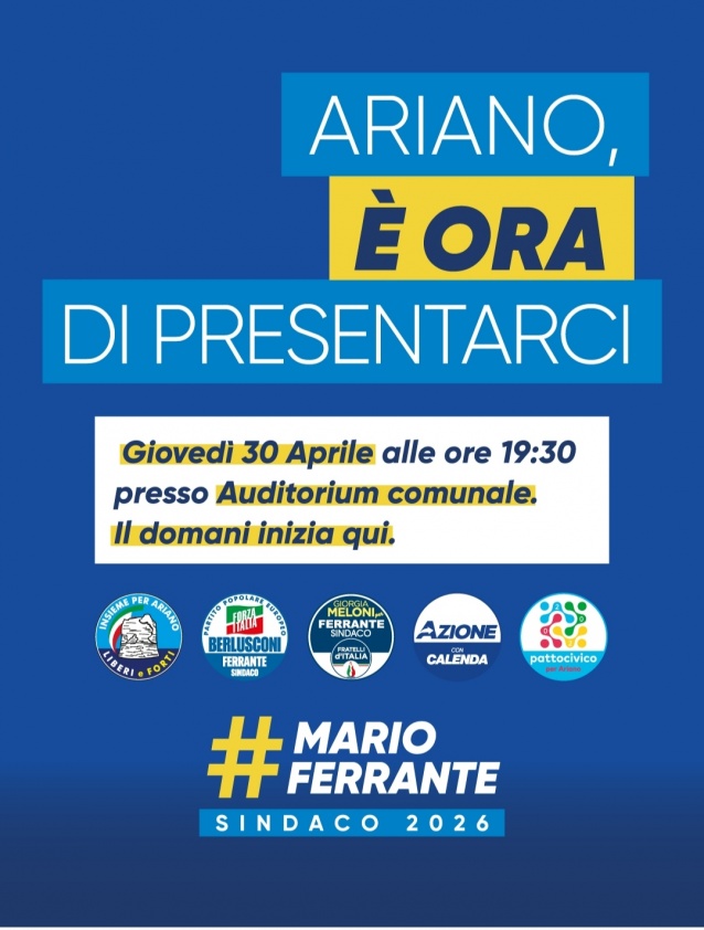 Giovedì 30 aprile, alle 19.30, presso l’Auditorium comunale Lina Wertmuller, il candidato sindaco Mario Ferrante presenterà liste e candidati. L’ex manager Asl è a capo di una coalizione composta da Fratelli d’Italia, Forza Italia, Liberi e Forti -Insieme per Ariano, Azione, Patto Civico.