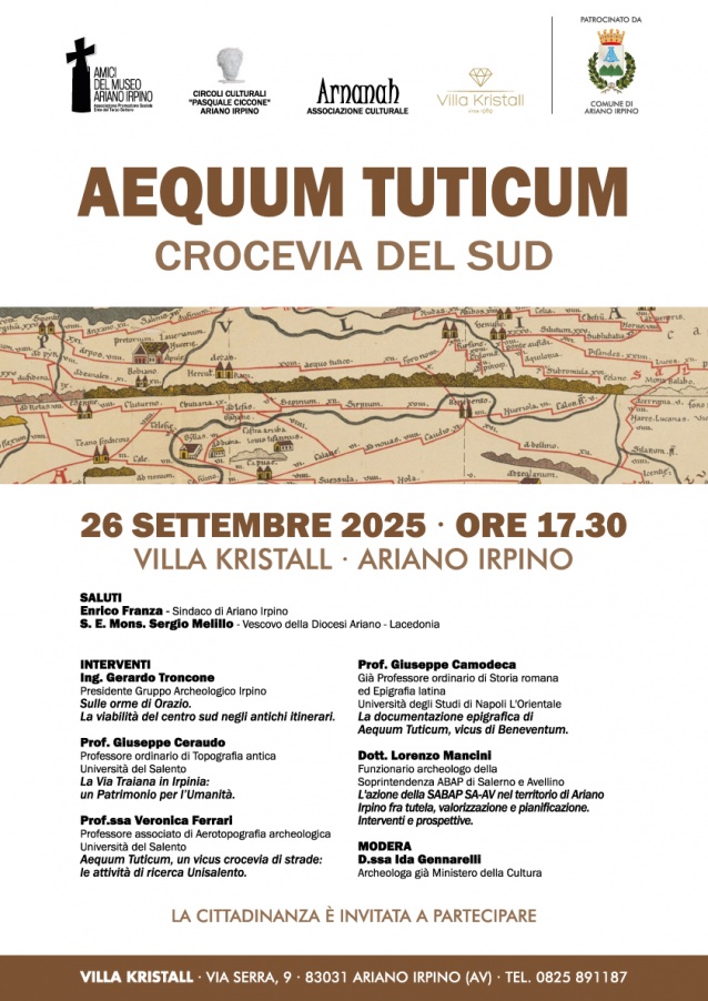 Le associazioni Amici del Museo di Ariano Irpino, Circoli Culturali “Pasquale Ciccone” e “Arnanah”, con il patrocinio del Comune di Ariano Irpino, organizzano il convegno dal titolo “Aequum Tuticum, crocevia del Sud”, che si svolgerà venerdì 26 settembre 2025 alle ore 17.30 presso Villa Kristall ad Ariano Irpino. L’incontro si propone di approfondire, in una prospettiva scientifica, il ruolo strategico dell’antico sito di Aequum Tuticum quale snodo fondamentale della viabilità antica, evidenziando l'importanza storica e le prospettive di valorizzazione.